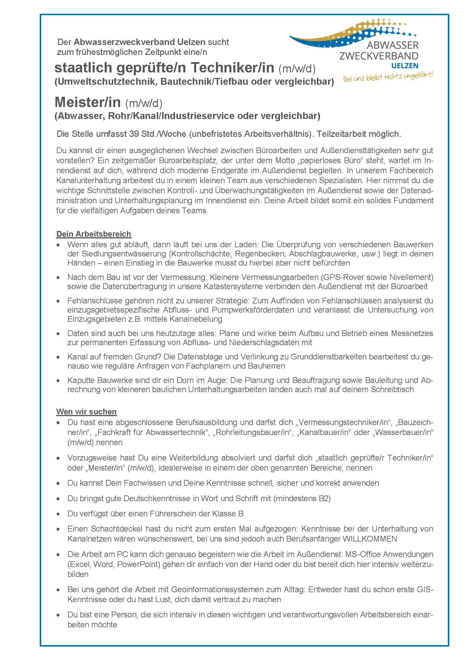 Der Abwasserzweckverband Uelzen sucht zum nächstmöglichen Zeitpunkt eine*n